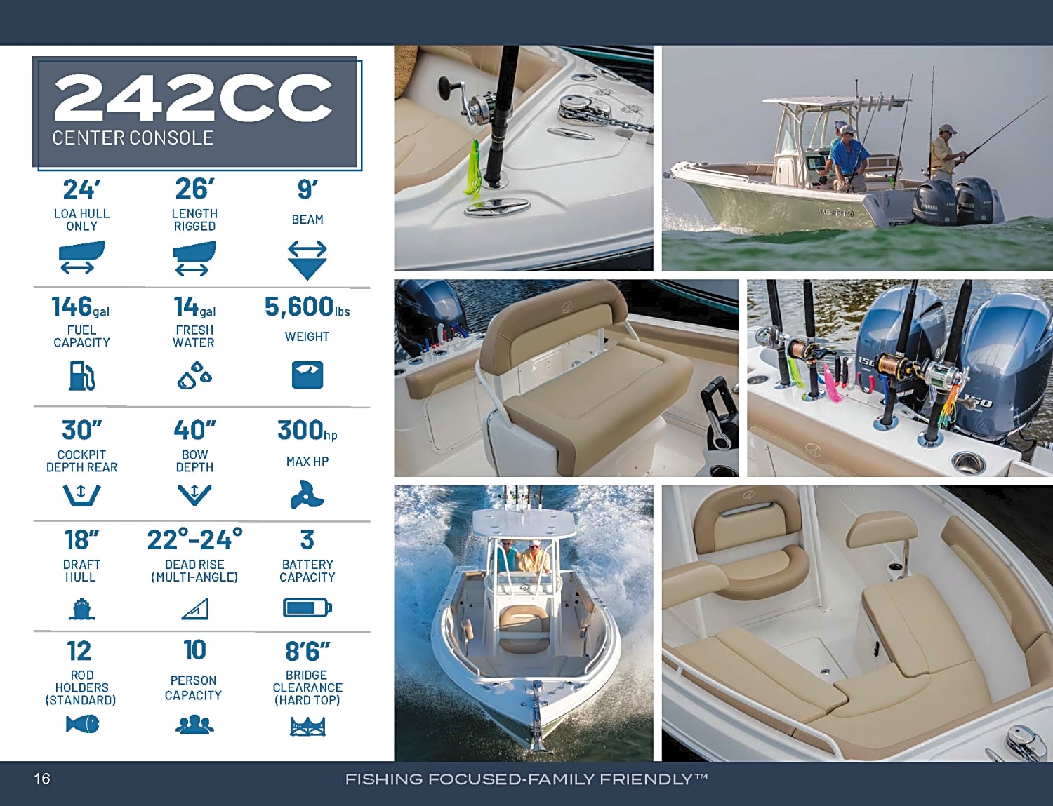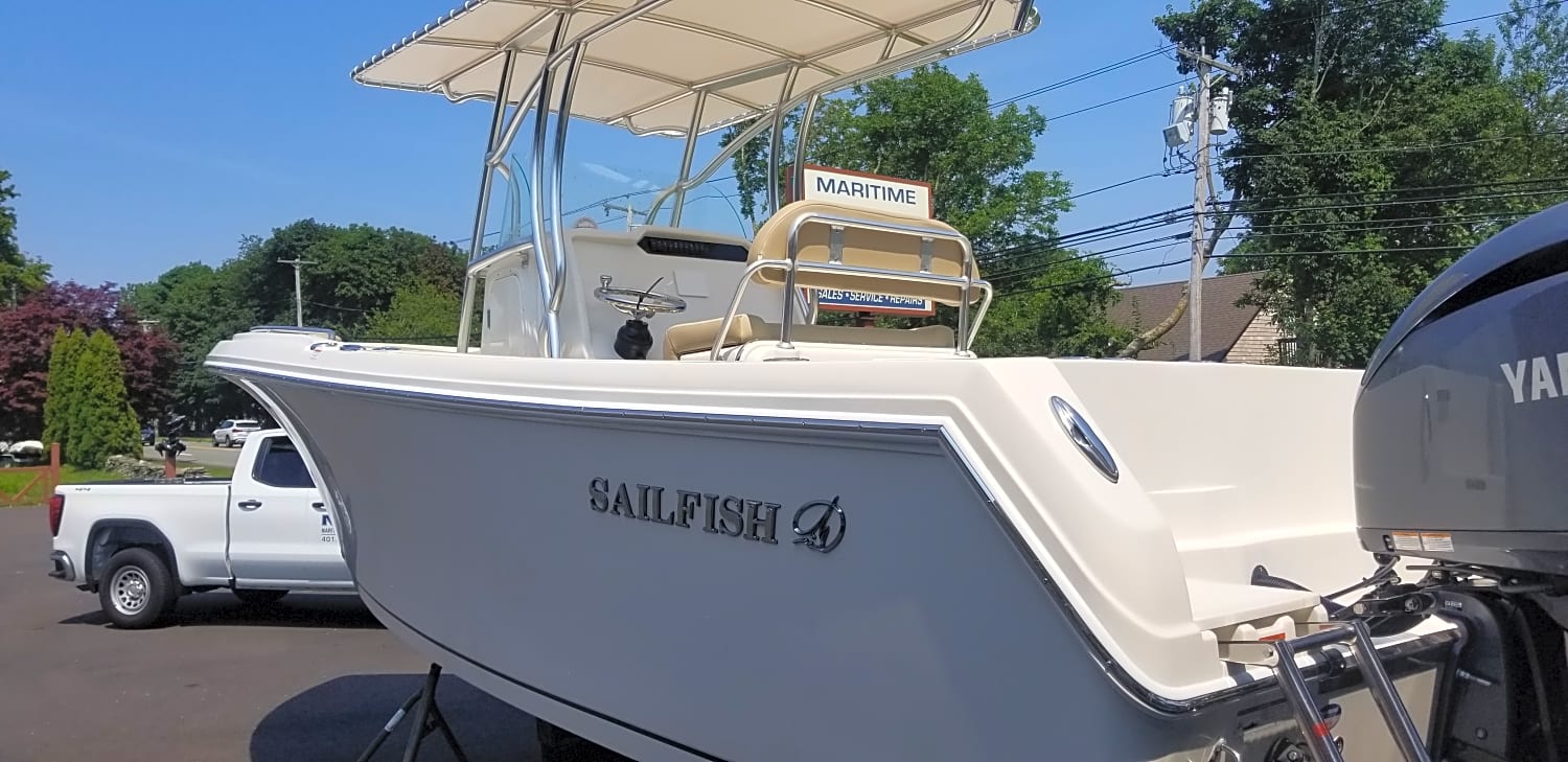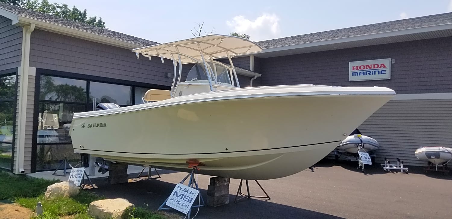 Brand new center console. Sailfish designed and built the 242CC for serious offshore fishing. However, like many manufacturers, Sailfish has come to understand that center console owners and their families enjoy recreation on their boat when not engaged in dedicated angling. The Sailfish 242CC incorporates well thought-out forward seating and other comfort features that make the boat capable for cruising, entertaining and watersports with the addition of the appropriate options