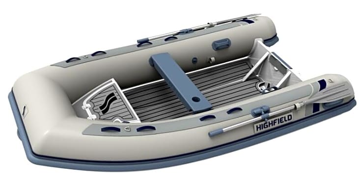 The Highfield Classic line of aluminum RIBs have an innovative double deck hull design that allows for water to drain beneath deck, keeping your feet and gear dry. The welded-in bow locker is large enough for a 3 gallon fuel tank, and with the double deck hull design, the fuel line can be run below the deck to the outboard motor at the transom. This not only provides added weight to keep the bow down but also keeps the fuel tank out of the boater's way at the stern.