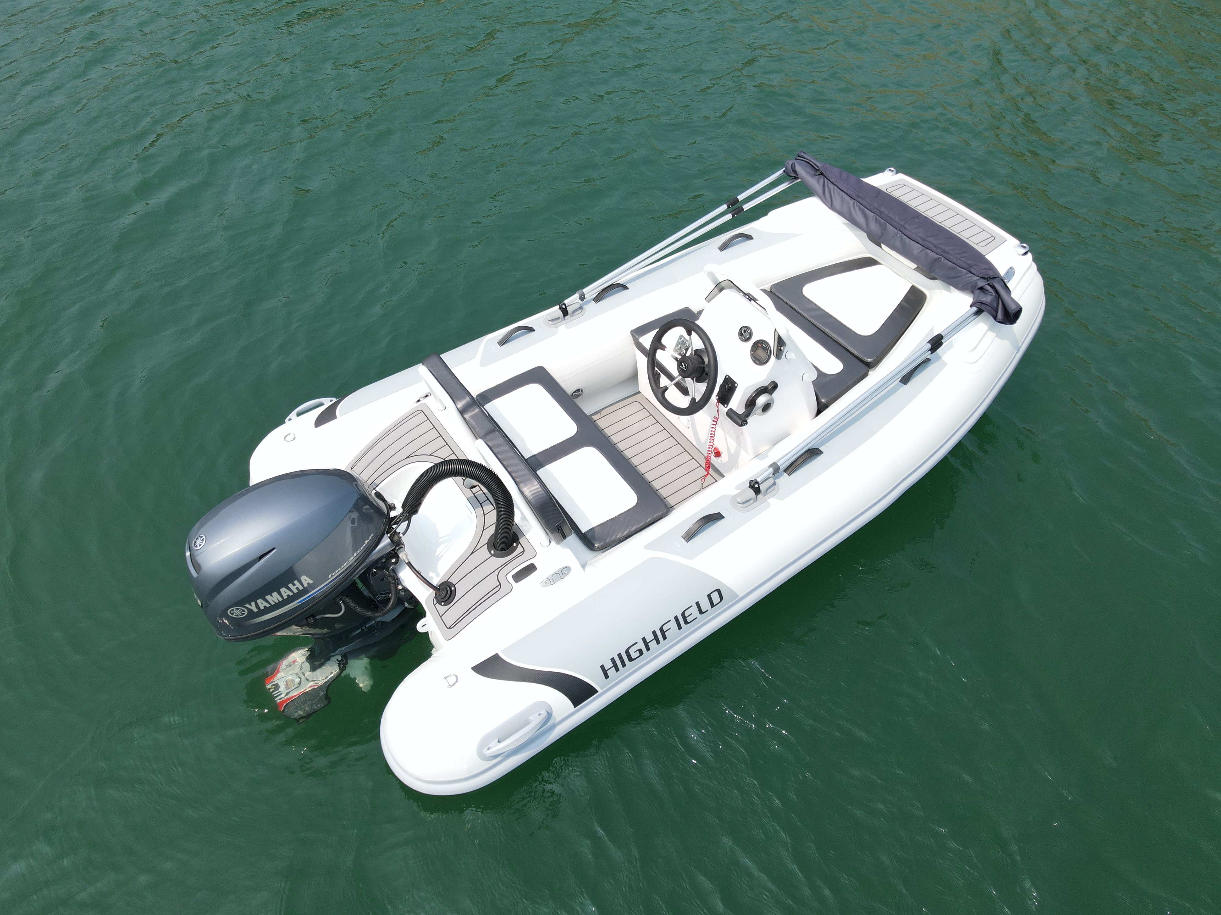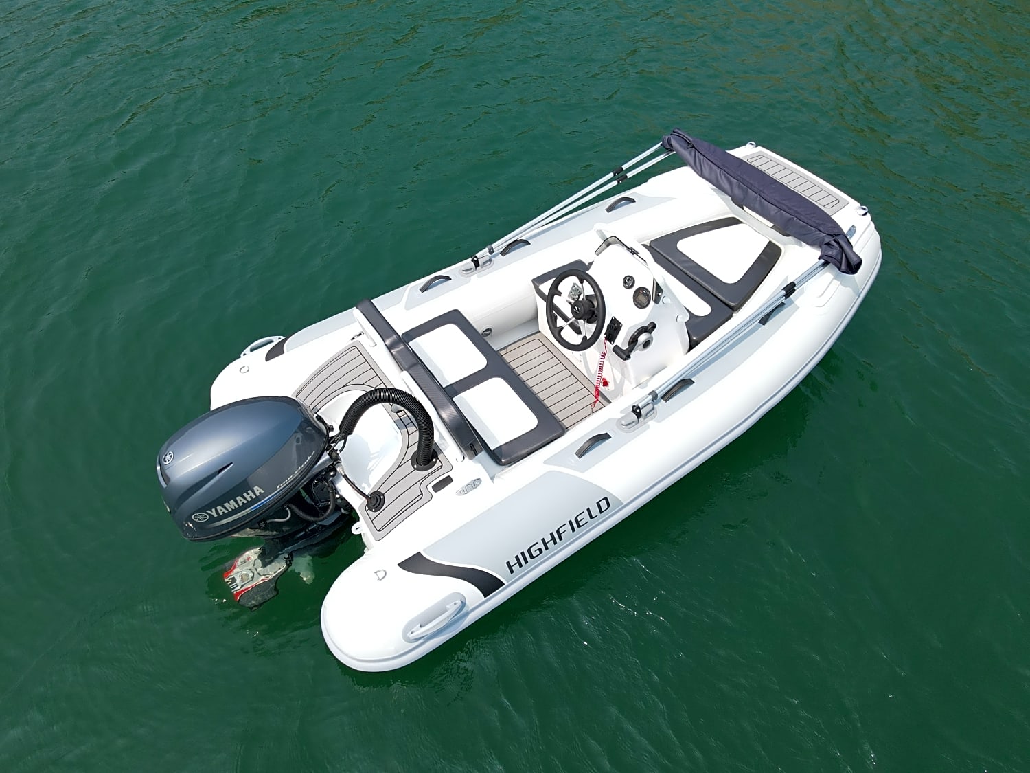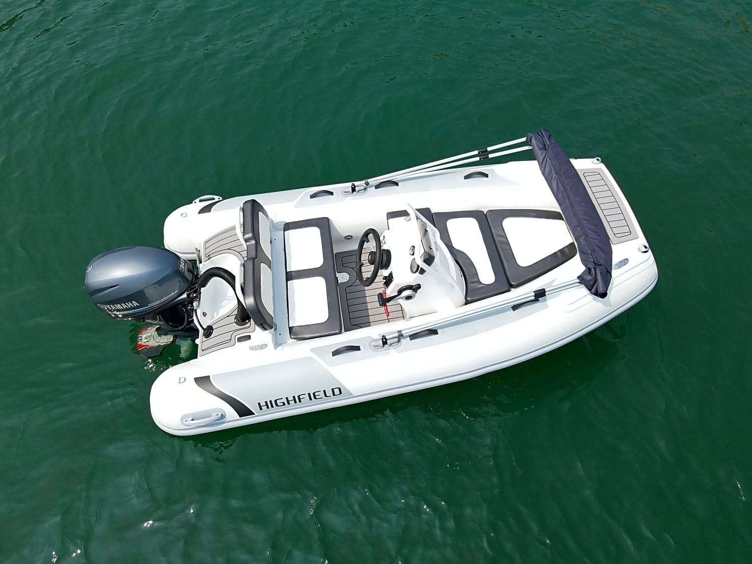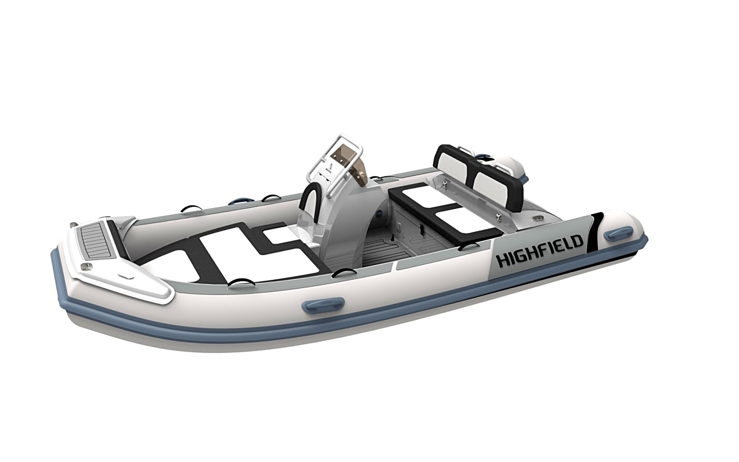 All models have the following standard equipment: ORCA® Hypalon or Valmex® PVC tube Flush mount non-return valves High tensile chromated & powder coated aluminum hull Self-draining deck Integrated rear seat with cushion Low profile console Integrated transom supports Lifting points and towing eyes Tow bridle points Brushed foam teak finish deck Heavy duty rubbing strake Full length keel guard Highfield dry bag Foot pump, oars, repair kit Electrical pack for boat & console