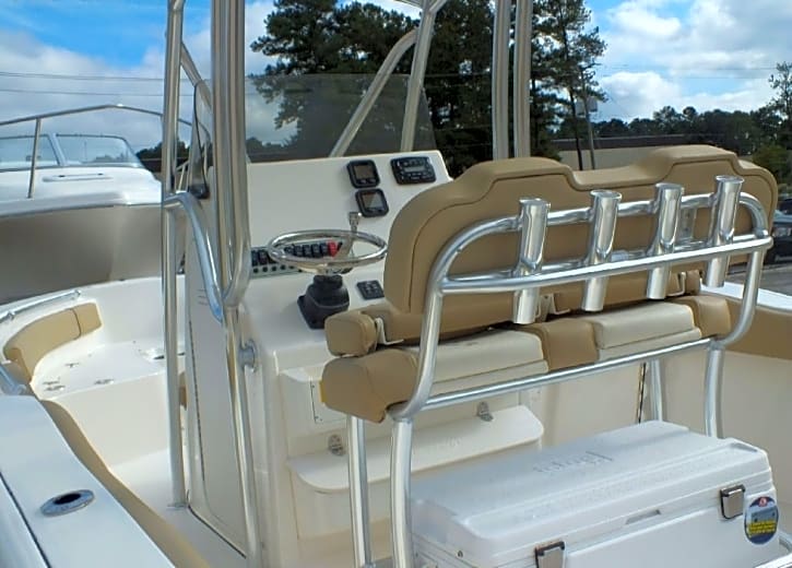 Console mounted foot rest with multiple storage compartments. Folding bolster leaning post converts to twin seats with back rest. Molded in front console seat with storage underneath. SS steering wheel Closed cell positive foam flotation Console cushions for front seat. Molded non-skid inner liner. Courtesy lights. Black accents. 4 SS trolling rod holders with integrated drains. Pull up cleats. Generous bow casting deck. Bow cushions. Sea Star hydraulic steering. Cockpit bolsters. Changing room under console can accommodate a potty. Recessed low profile bow rail. Cup holder on console. 20 gallon live well. Fwd. in floor fish box is macerated with overboard drain. High pressure raw water wash down system. Trim tabs with indicators and auto retract. Live well with high speed pump pickup. Molded in gunwale rod storage. Storage area or fish box under the floor. Anchor locker with hatch lid. Stainless Steel Hardware. 12 volt power outlet on dash. Large storage compartment in bow. Electric horn. Compass. Tinted windshield with SS grab rail Engine builder matched analog gauge package. Bench seat cushion and backrest with cushion. Dual Battery Switch Two Large Storage Boxes in Bow Molded Swim Platform with Stainless Steel Ladder Bilge Pump with Automatic Switch Built-In Fuel Tank Foam Injected Fiberglass Stringer System Self-Bailing Cockpit High Speed Pick-Up Livewell No Wood-No Rot Construction Ten (10) Year Hull Warrantytures